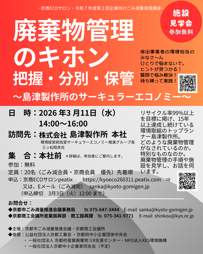 【施設見学会】廃棄物管理のキホン[把握・分別・保管]~島津製作所のサーキュラーエコノミー~ [ 企業向けごみ減量実践講座 ]