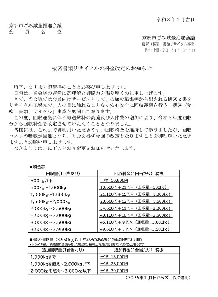 回収料金改定のお知らせ(機密書類) [ 秘密書類(機密書類)リサイクル ]